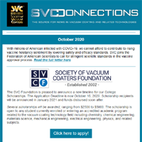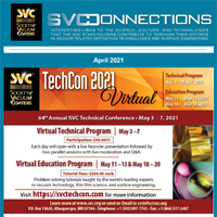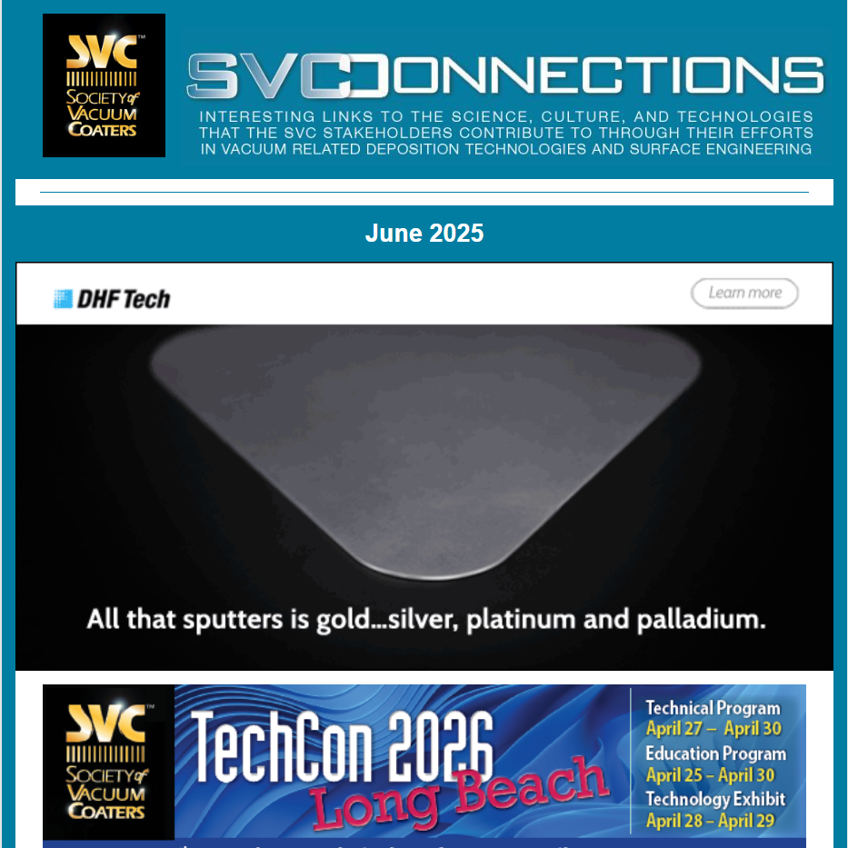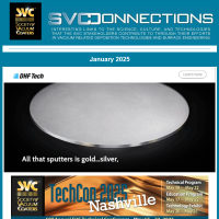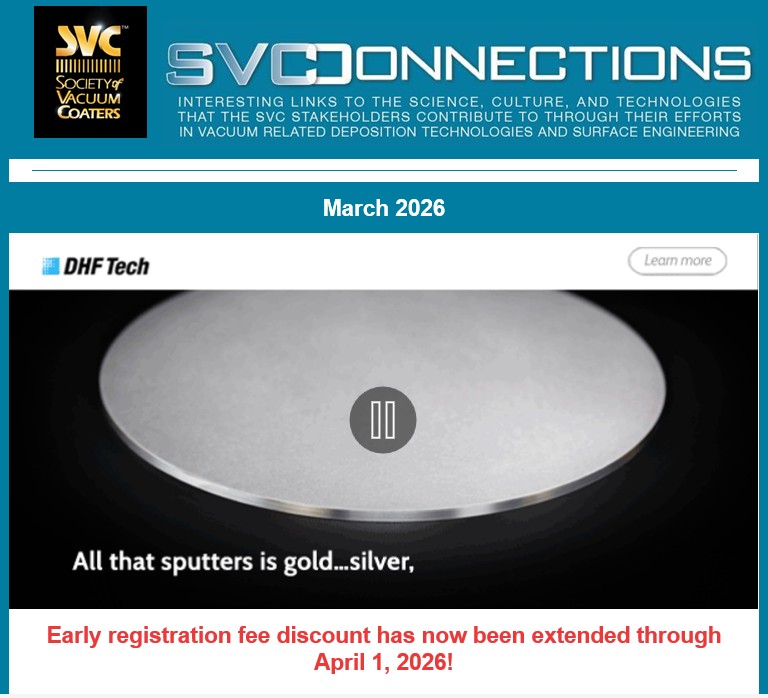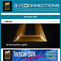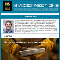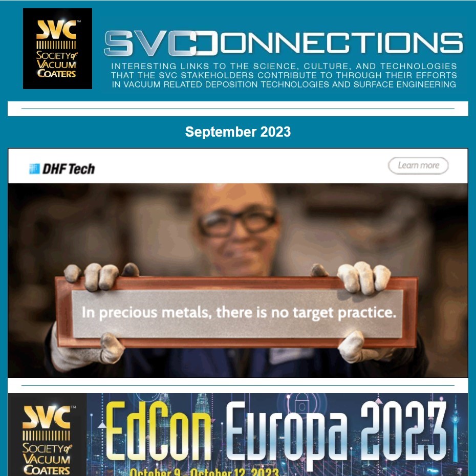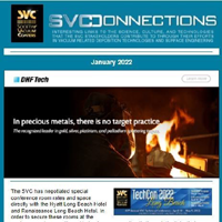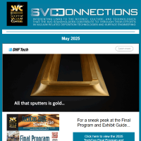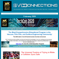 SVConnections is a monthly e-newsletter, dedicated to informing our readership about the latest in vacuum technology and industry news, important Society announcements and global discoveries that affect our economic and personal future. Deployed the first Wednesday of each month, SVConnections is distributed to our entire database of vacuum coating professionals and experts.